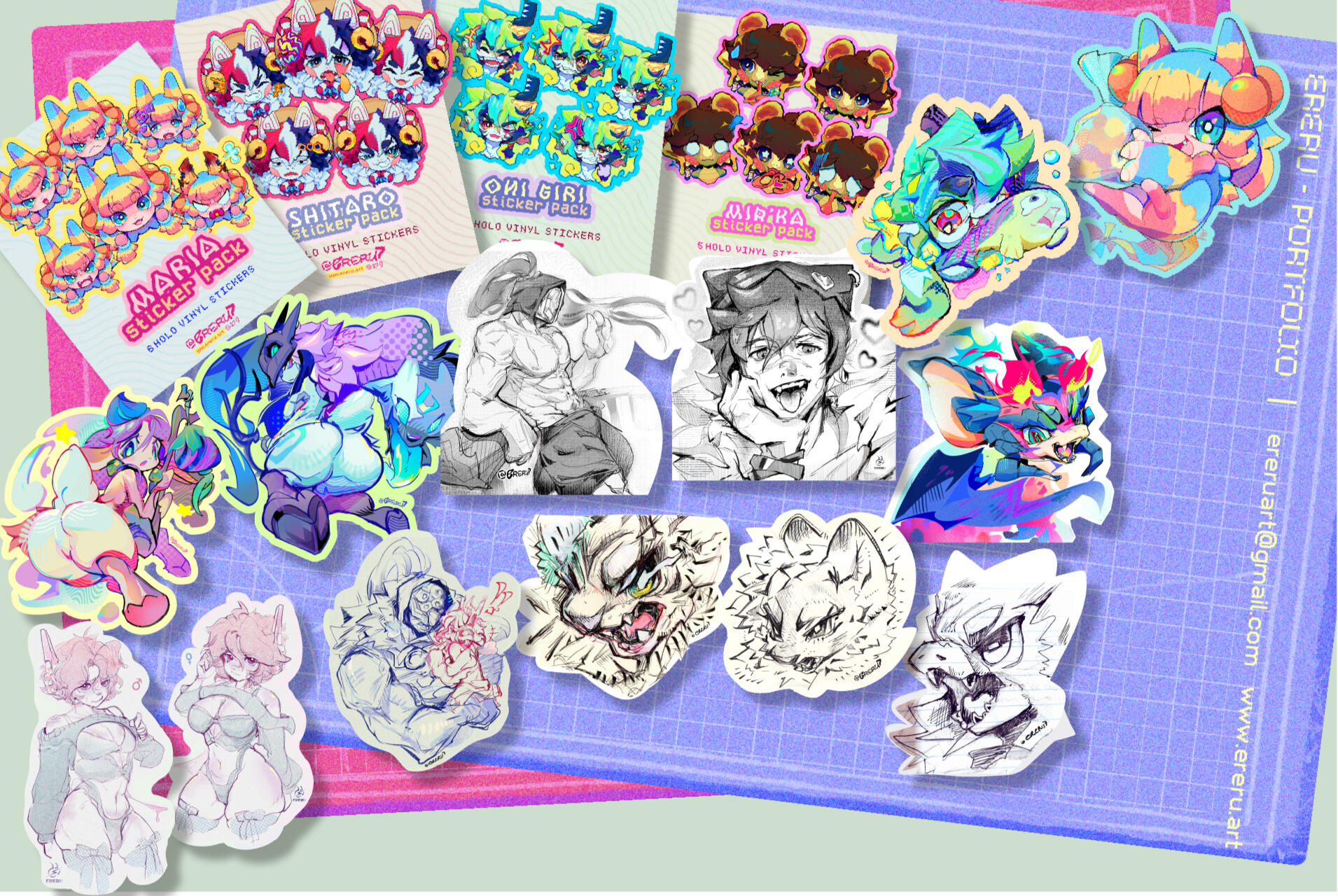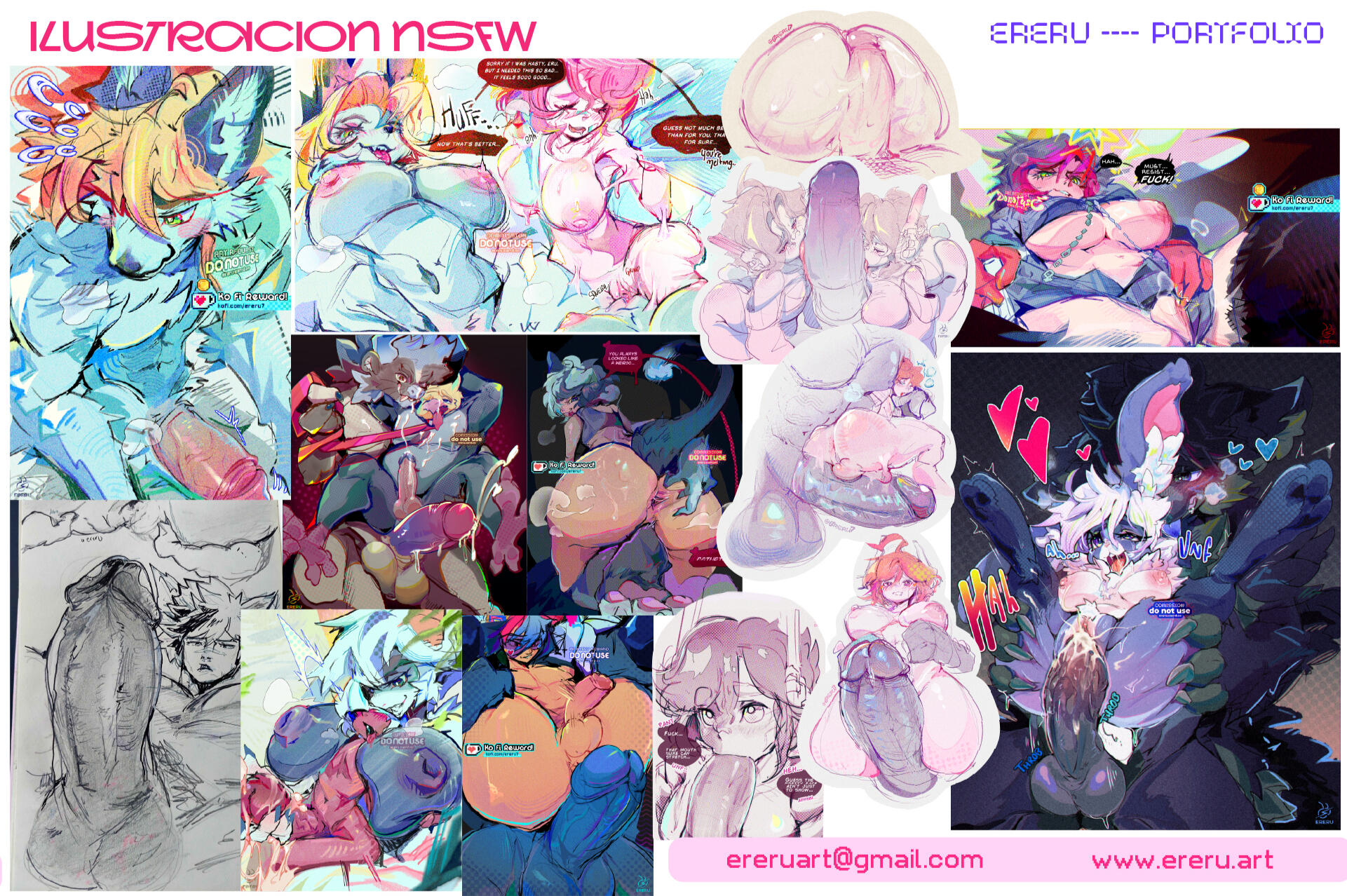 Mi arte erótico / pornográfico es diverso; contiene todo tipo de parafilias, sexualidades, cuerpos, genitales e identidades. ya que creo fervientemente en que todo ser humano merece ser representado y tener material de ésta indole que lo satisfaga, alivie o dignifique.Larga lista de las cosas que hago aquí.